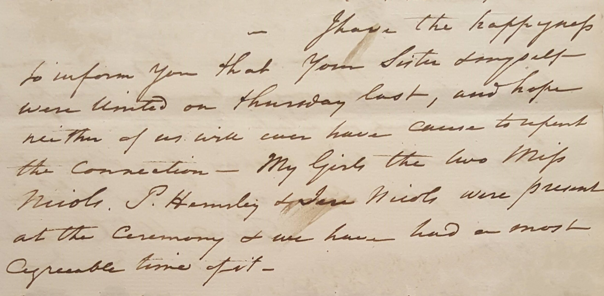 Whether out of affection or duty, only two months after receiving Hemsley’s proposal, the pair wed on December 26, 1797. Col. Hemsley tells Tilghman of the event and “hope neither of us will ever have cause to repent the connection” (Image 1).[2]