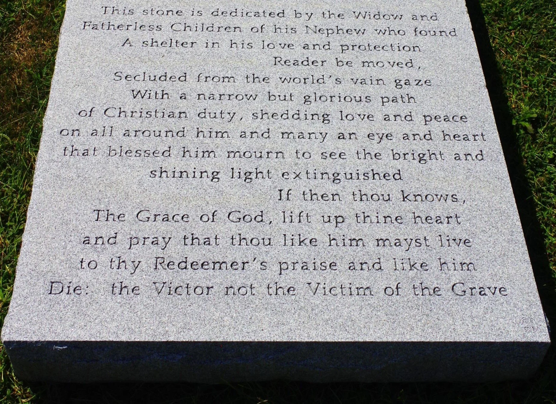 Figure 5: William Hemsley, Esq.’s current ledger stone was placed on top of the deteriorated original stone during an early-2000s cemetery repair and restoration effort. Both the original and the replacement stone bear Key’s poem. Photo by Sherri Marsh Johns.