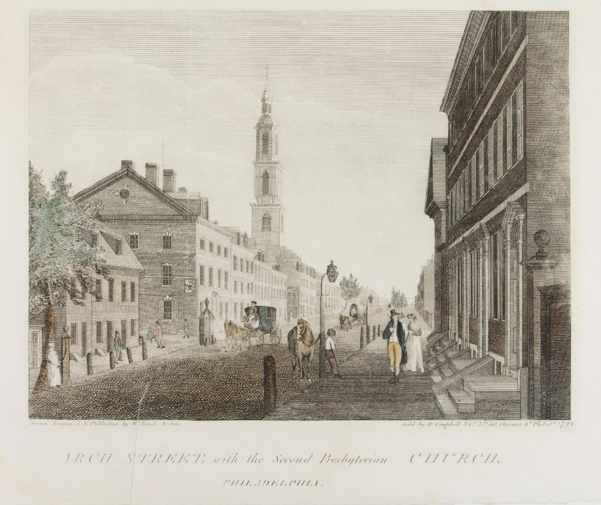 Figure 2: Philadelphia in 1799 as shown in this engraving titled “Arch Street, with the second Presbyterian Church,” published by W. Birch & Son. Photograph courtesy of the Library company of Philadelphia.