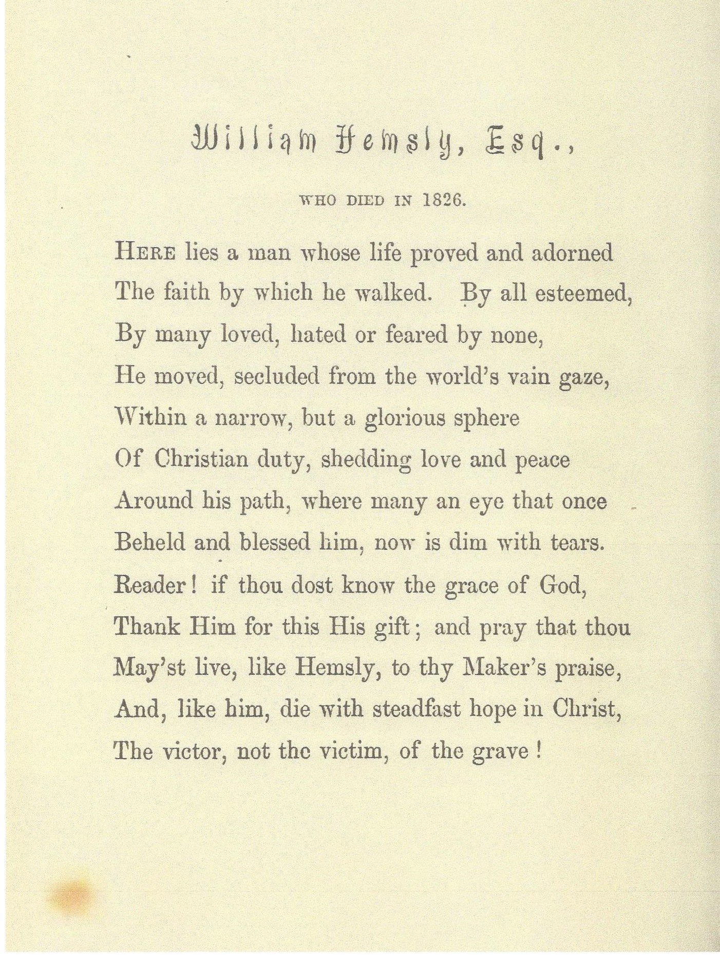 A collection of Key’s poems was published in 1857, after his death, and released nationally (Figures 3 and 4). Many of Key’s other poems had religious themes that were used a Christian Hymns. Notably, the volume included a piece written in memory of his friend William Hemsley, Esq. that he penned some three decades earlier as an epitaph for Hemsley’s gravestone (Figure 5).